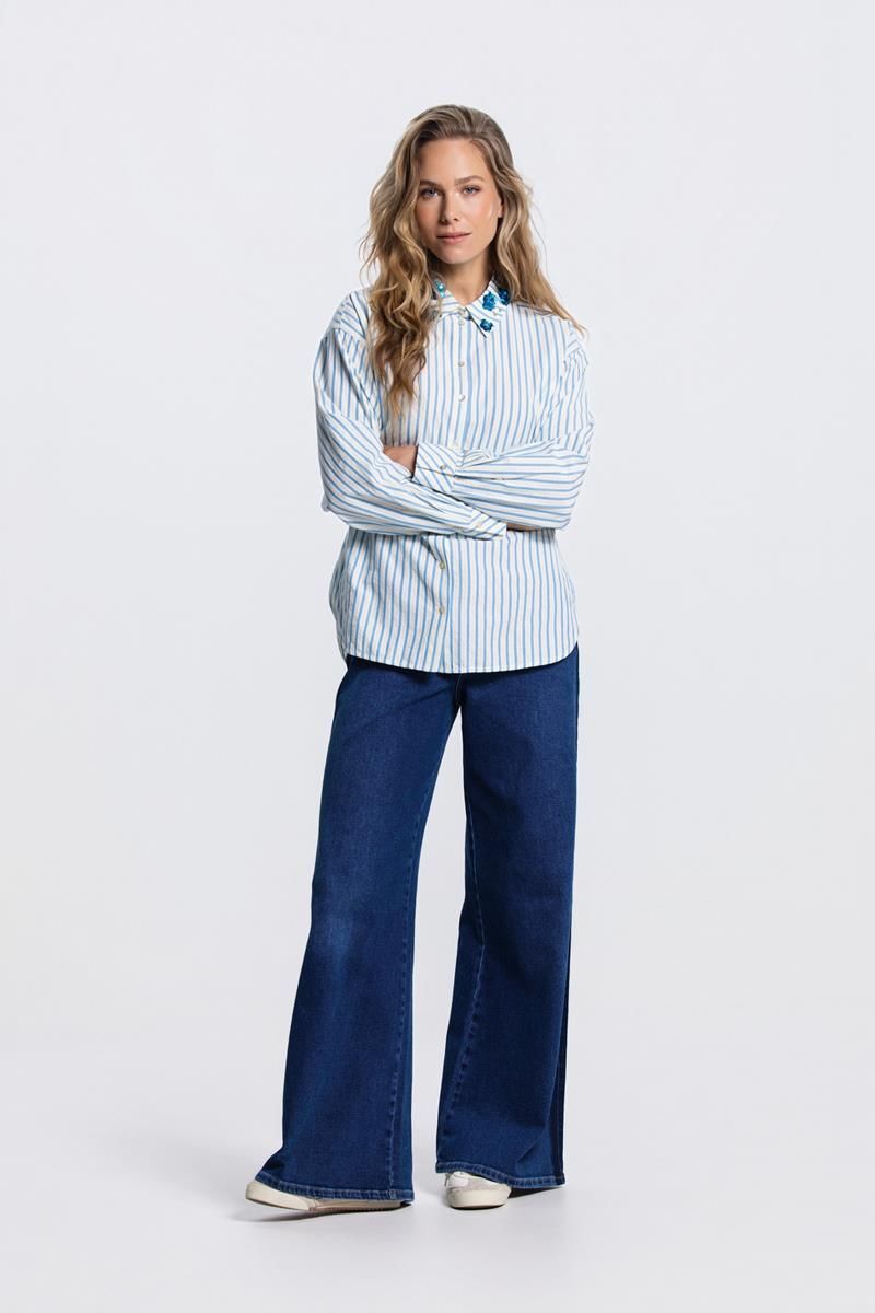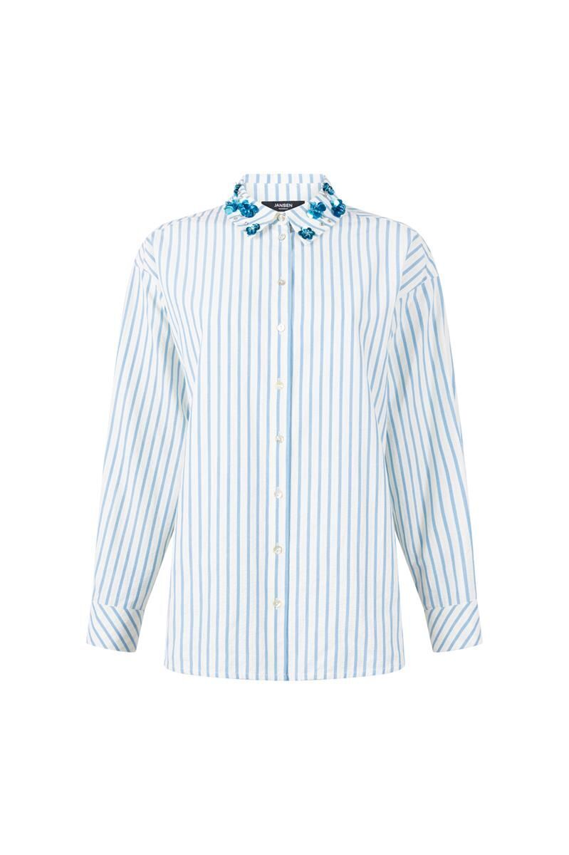 De Micky blouse is een regular fit model met een verfijnd off-white en aquamarijn streepdessin. De kraag en manchetten zijn voorzien van subtiele sequin bloemen in aquamarijn, wat de blouse een elegant en vrouwelijk fashiondetail geeft. Een stijlvolle keuze voor zowel werk als vrije tijd.50% Viscose, 50% Polyester.