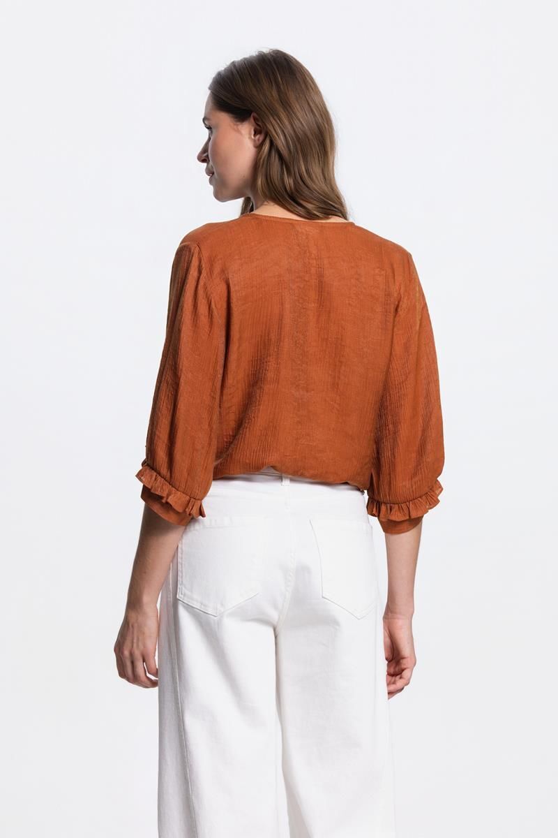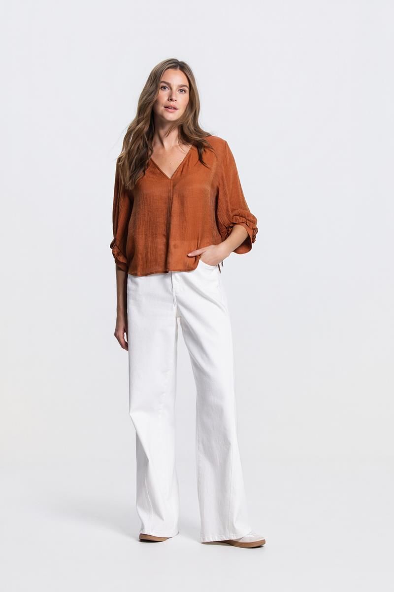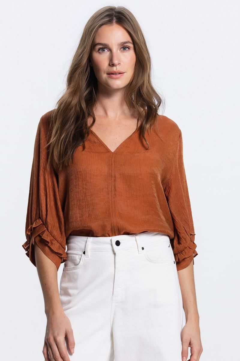 De Pelin blouse in Toffee is een elegant model met V-hals en 3/4-mouwen met speels detail aan de uiteinden. Gemaakt van een verfijnde kwaliteit, casual-chic uitstraling. Comfortabel en stijlvol voor iedere gelegenheid.91% Viscose, 9% Polyamide.