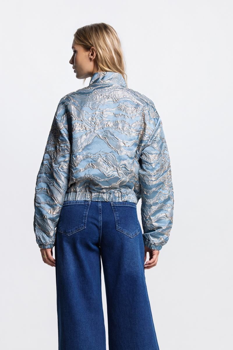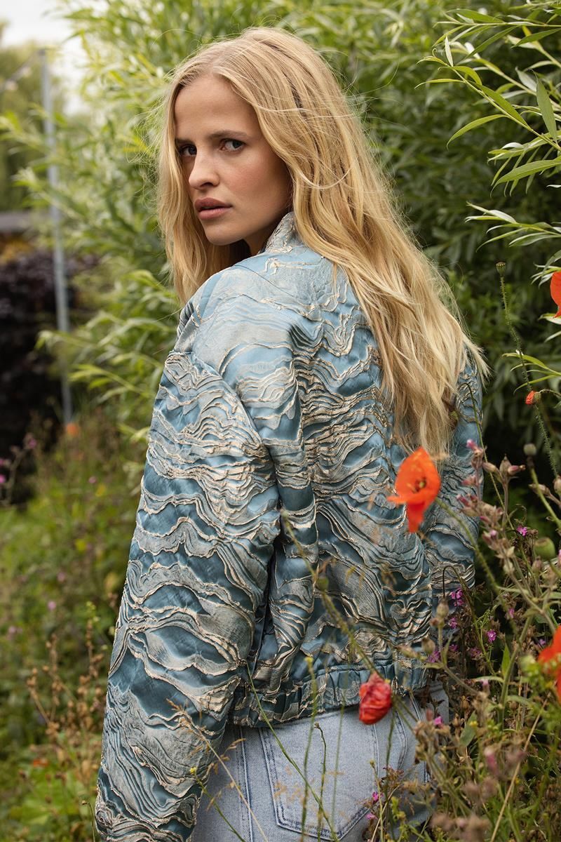De Qwen bomberjas in aquamarijn is gemaakt van jacquardstof met een elegant gouden design. Voorzien van steekzakken, ritsluiting, subtiel boord bij de halslijn van dezelfde stof en elastiek in onderrand en mouwboorden. Gevoerd voor extra comfort en een luxe uitstraling.100% Polyester.