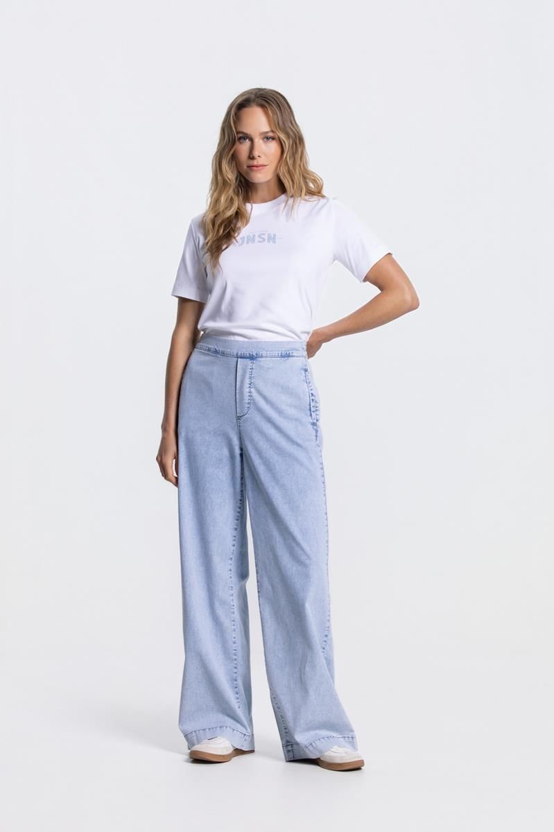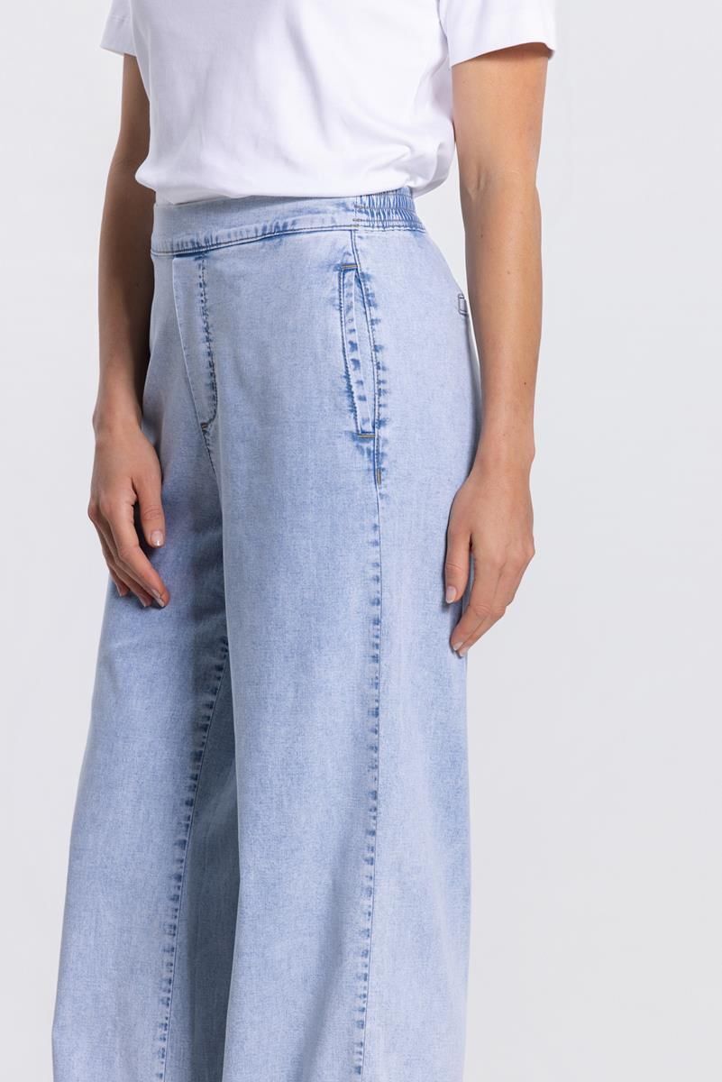 De Saar broek in lichtblauw is een wide leg model in soepele jeans-look. Voorzien van elastische achterzijde, paspelzakjes achter, insteekzakken en blinde gulp voor een comfortabele en stijlvolle pasvorm. Perfect voor een casual-chic of dagelijkse look.98% Katoen, 2% Elastaan.