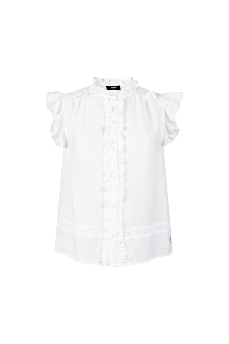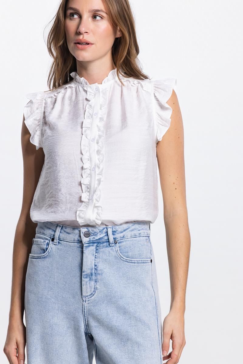 De Sulan mouwloze blouse in wit is elegant en luchtig, met subtiele details bij de halslijn en langs de knopenlijst. Afgewerkt met een fijne ruffel bij het armsgat voor een vrouwelijk accent. Ideaal voor een casual-chic of verfijnde look.80% Viscose, 20% Polyester.