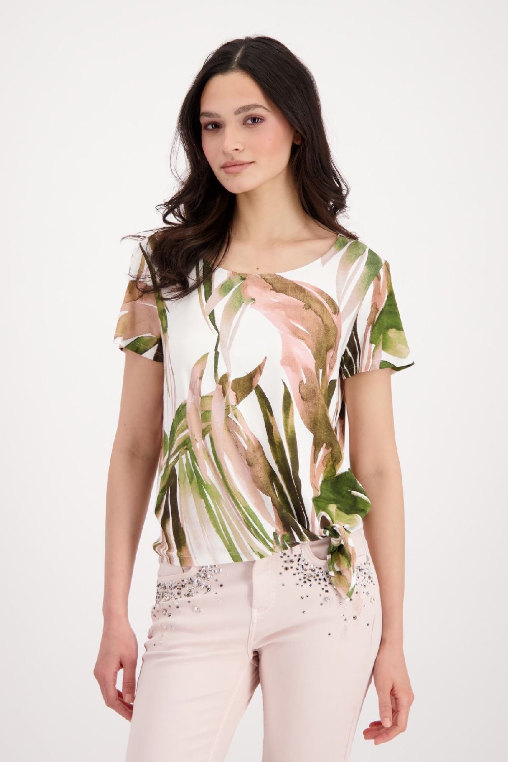 Het dames t-shirt van monari heeft een stijlvol design met een palmboom patroon. Het bloemenpatroon wordt verfijnd door een trendy zoom met knoop. De vorm: regular fit met een ronde halslijn, halve mouwen en voorwaartse schoudernaden. Soepelvallende viscose en een vleugje stretch zorgen voor een comfortabele pasvorm.95% Viscose 5% Elastaan