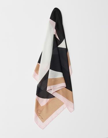 De zachte vierkante sjaal met ongewone print doet denken aan een abstract kunstwerk. Een favoriet stuk voor creatieve looks.100% Polyester.