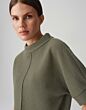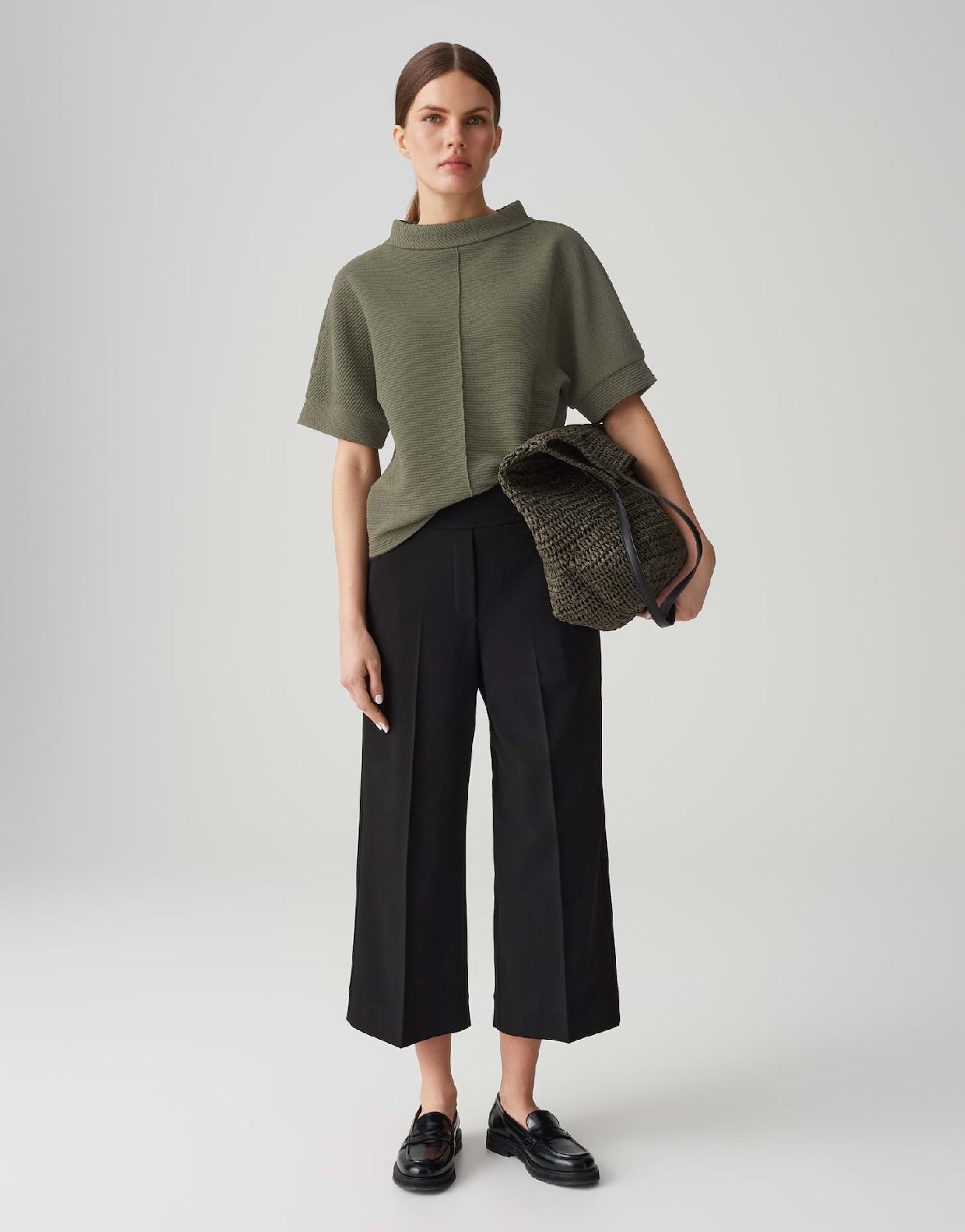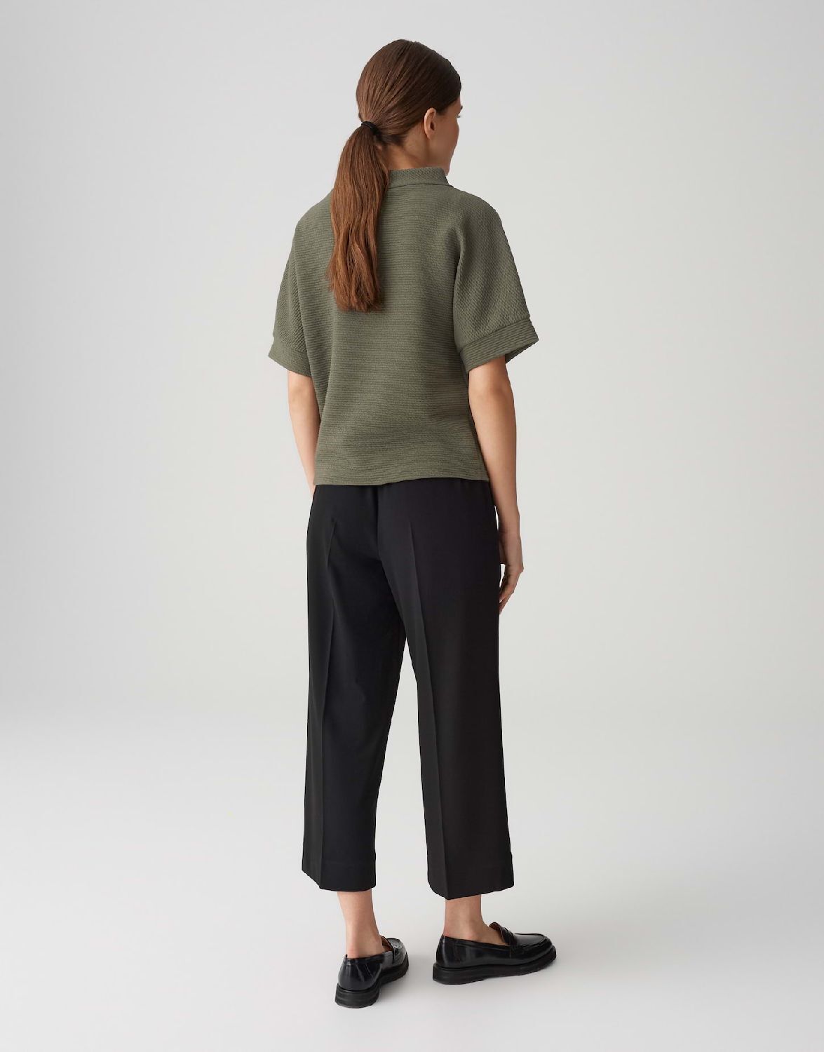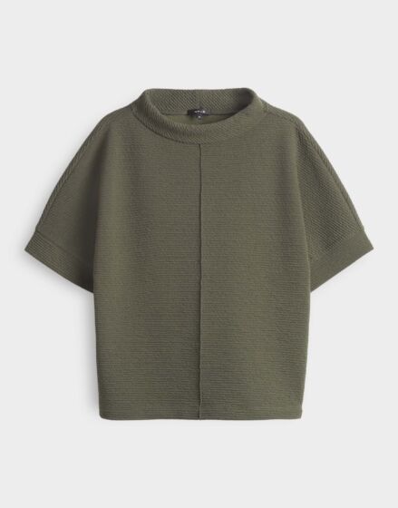 Sweater met korte mouwen en een vormvaste geribde textuur in een ottoman-look, modern geïnterpreteerd met een omgeslagen opstaande kraag. Een statement piece voor in de stad met duidelijke lijnen en een speciale focus op details.74% Polyester, 25% Katoen, 1% Elasthaan