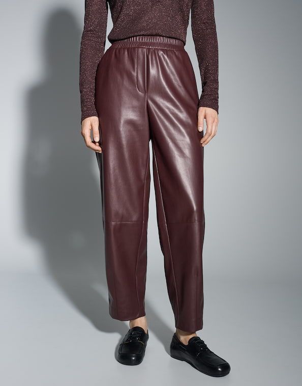 De tonvormige pasvorm van zacht imitatieleer met opvallende ovale pijpen herinterpreteert moderne feestelijke looks. Stijlvol met een bijpassend kort jasje of ontspannen met gebreide kleding, deze broek is een veelzijdig hoogtepunt.100% Polyester.