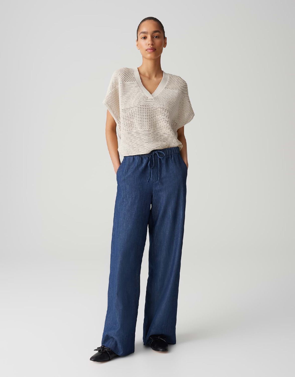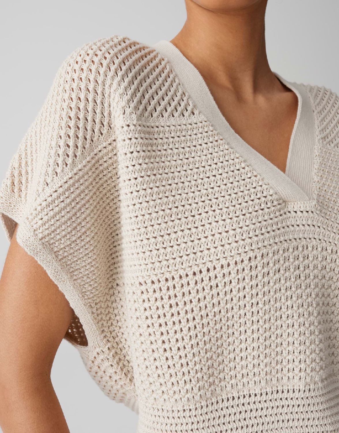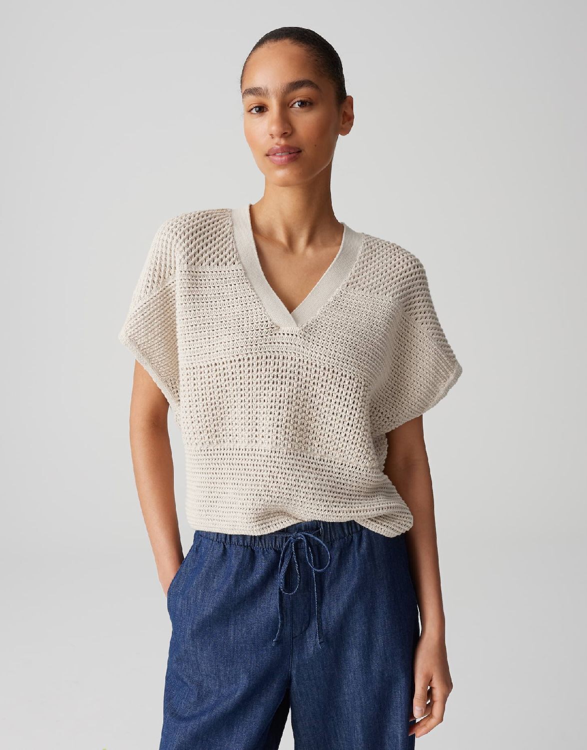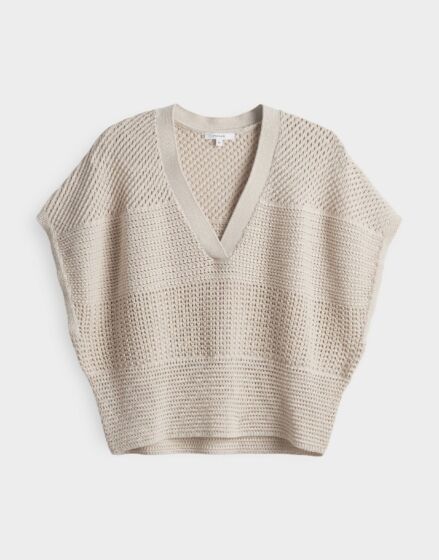 Ongecompliceerd slipover gebreid shirt met een casual V-hals heeft een open gebreide streepstructuur die smaller wordt naar de zoom toe, waardoor een vrouwelijk silhouet ontstaat met veelzijdige laagjesmogelijkheden.100% Katoen.