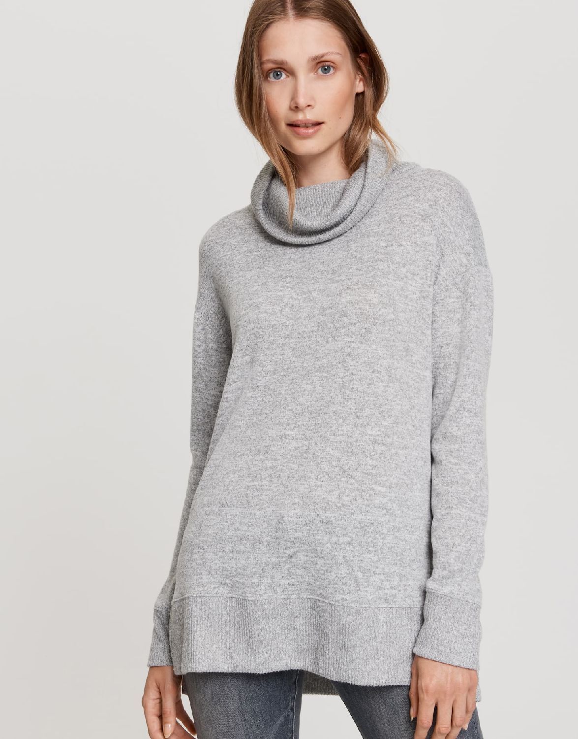 Fijn gebreide trui met colkraagOnderaan een boord met splitLange mouw met split