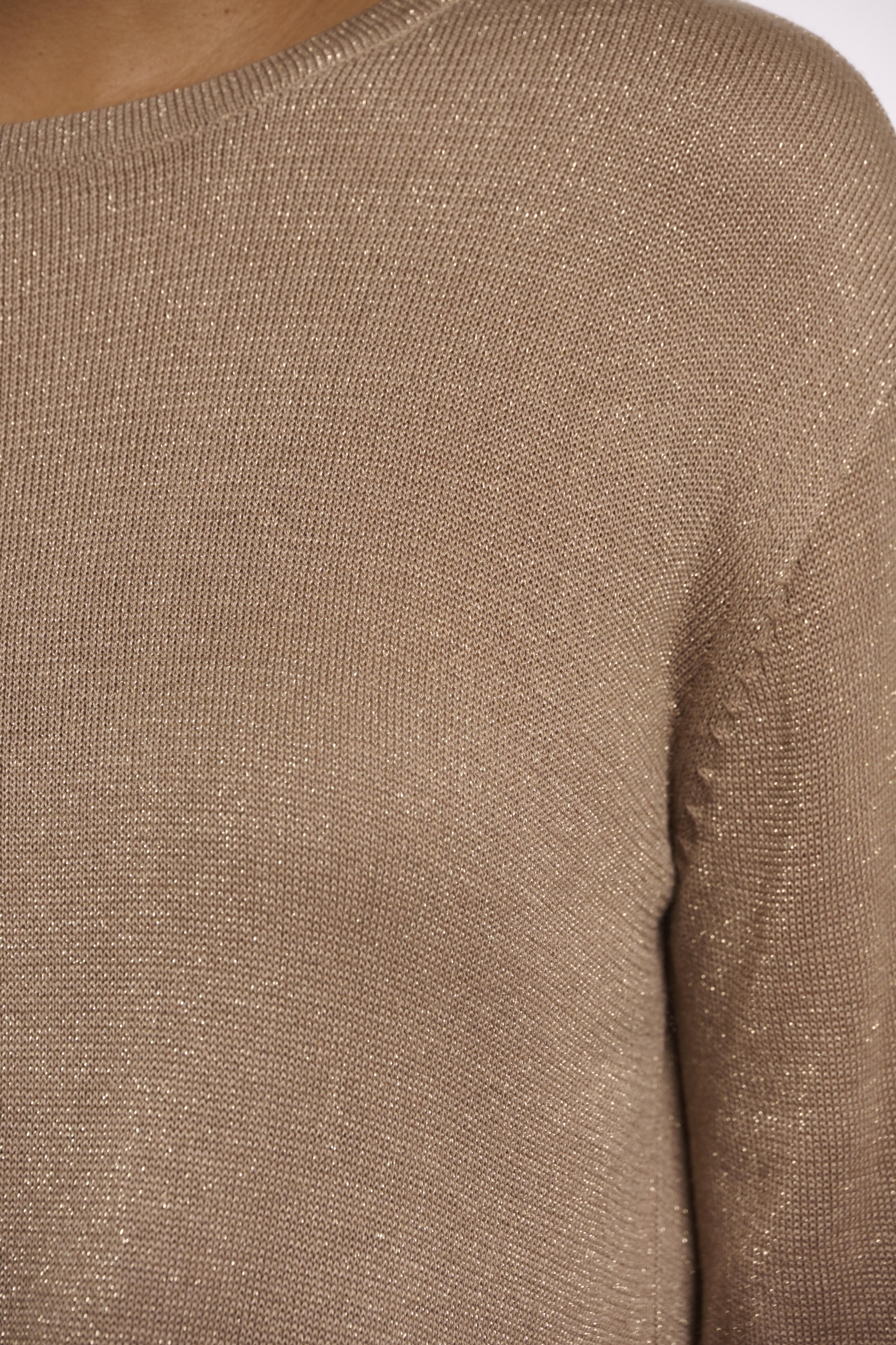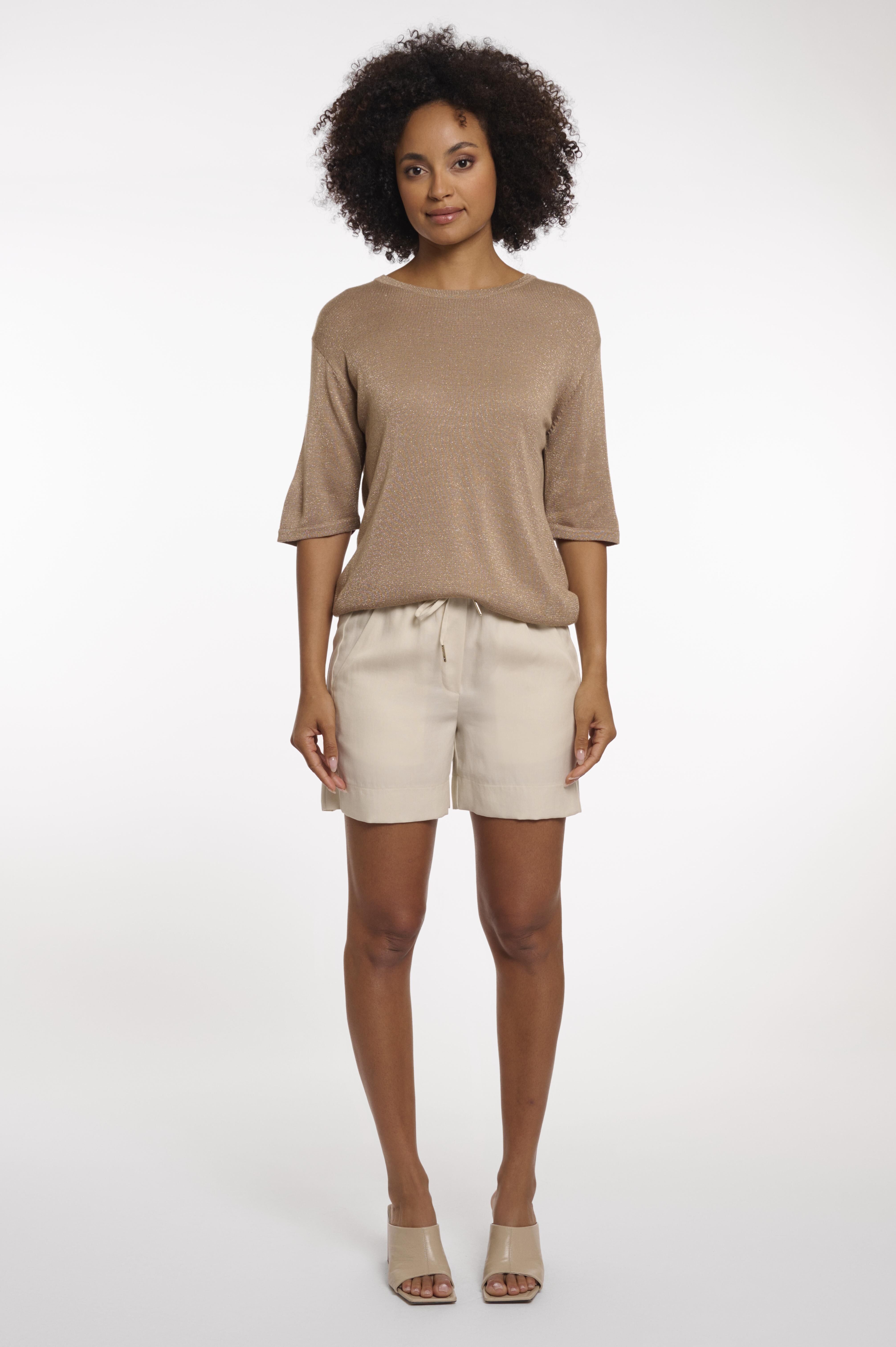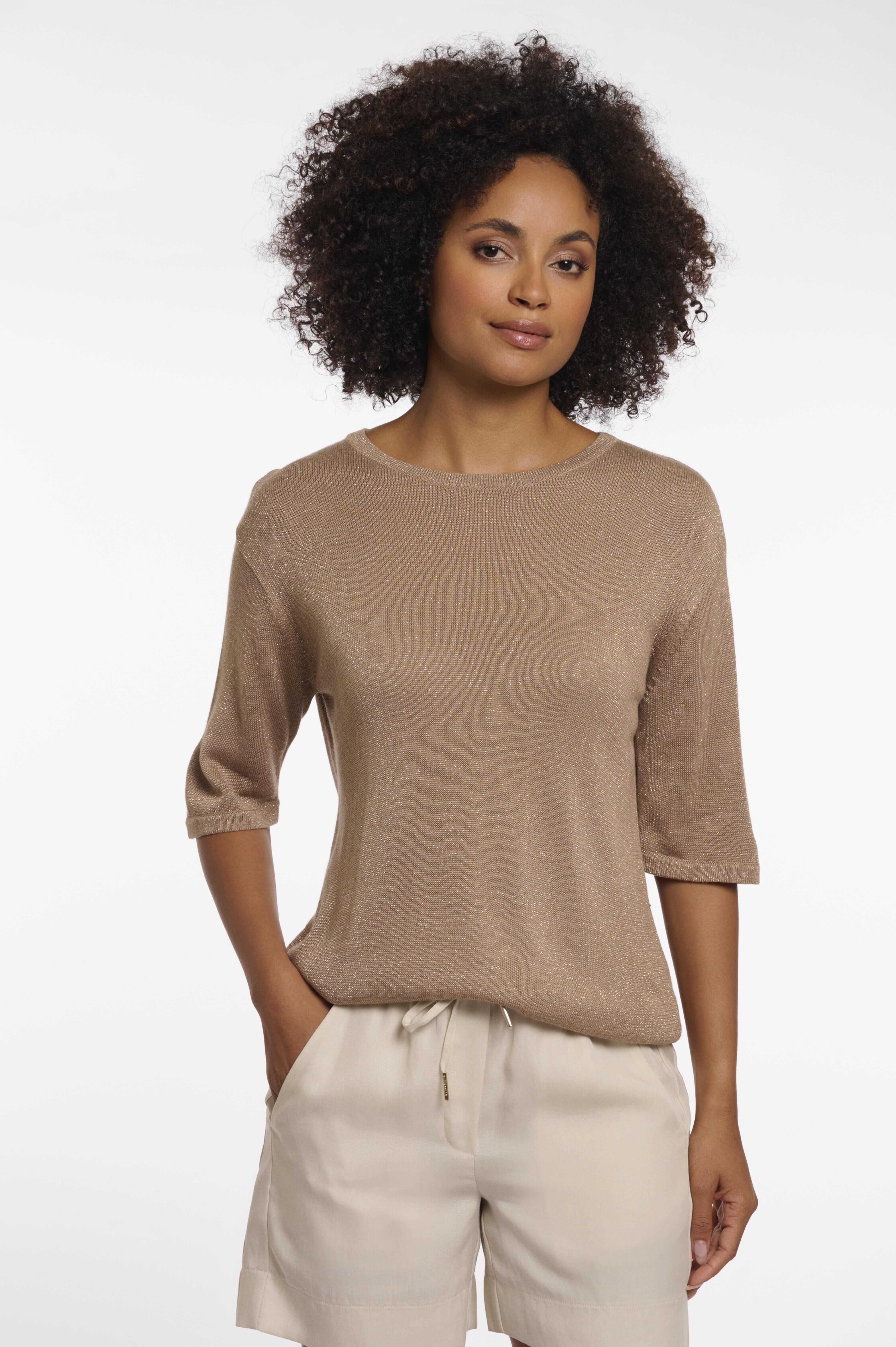 Een lichtgewicht gebreide top met een subtiele glans die het licht op een ingetogen manier weerkaatst. De rechte pasvorm, halflange mouwen en verfijnde ronde halslijn geven het een tijdloos silhouet.47% viscose, 44% acryl, 5% polyamide, 4% gemetalliseerde vezels.