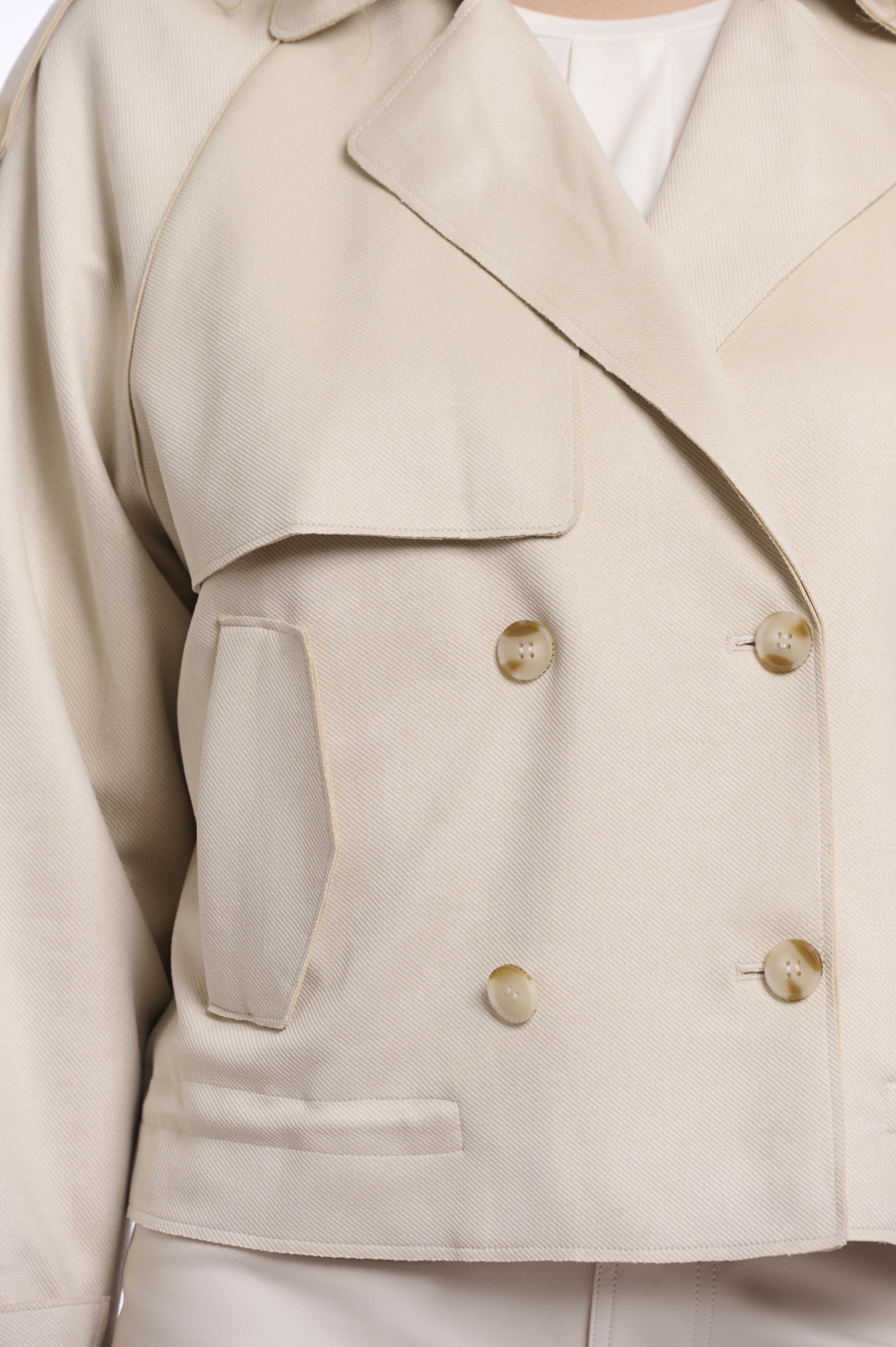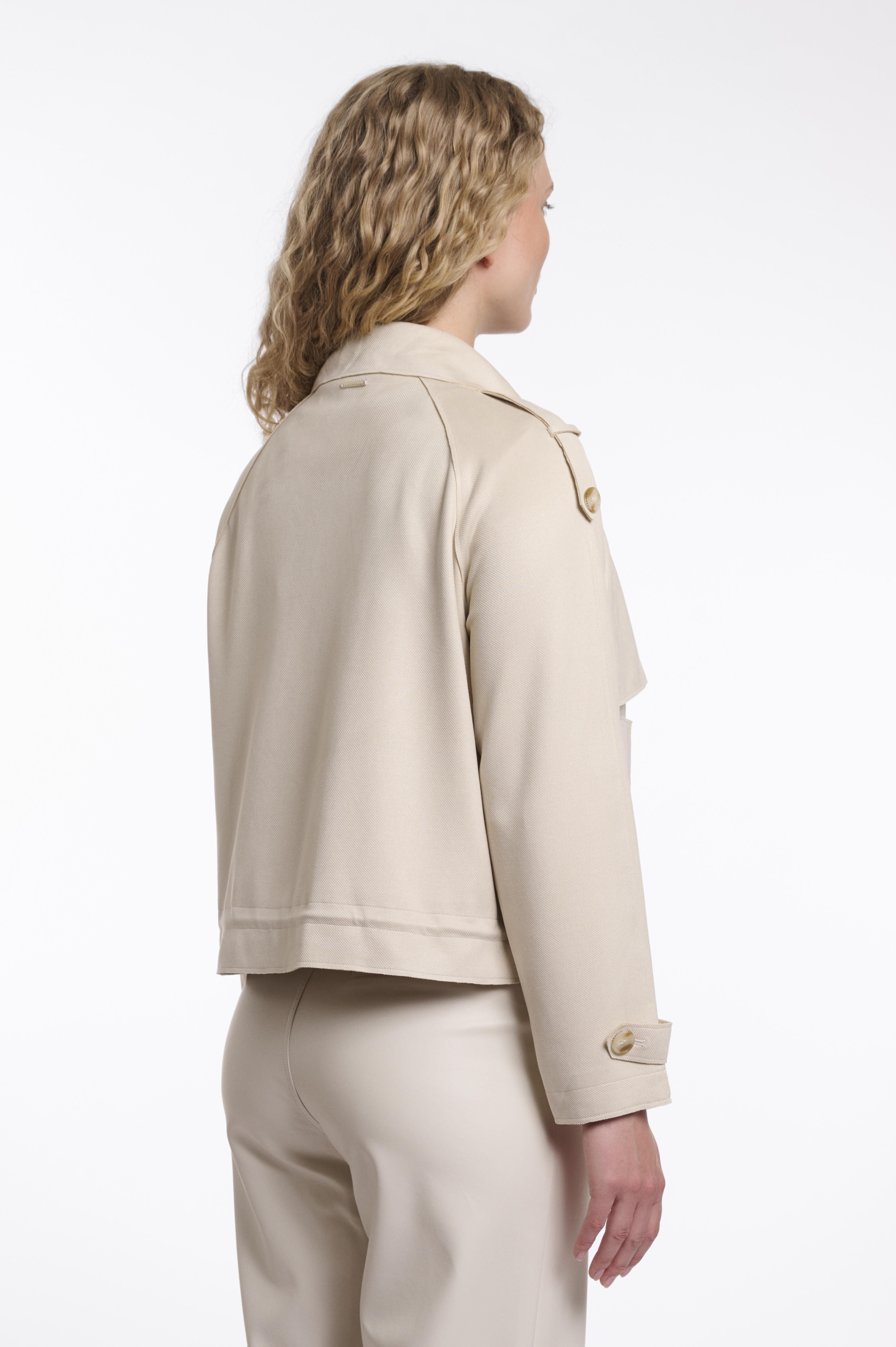 Hul jezelf in moderne elegantie met deze korte trenchcoat, gemaakt van zacht imitatiesuède voor een gladde, verfijnde look. Ontworpen met klassieke trenchcoatdetails; dubbele knoopsluiting, schouderbandjes, manchetbandjes en paspelzakken, voor een tijdloos en toch eigentijds silhouet. De rechte pasvorm en gestructureerde revers maken het een moeiteloos gepolijste keuze voor dagelijks gebruik.75% polyester, 20% gerecycled polyester, 5% elastaan.