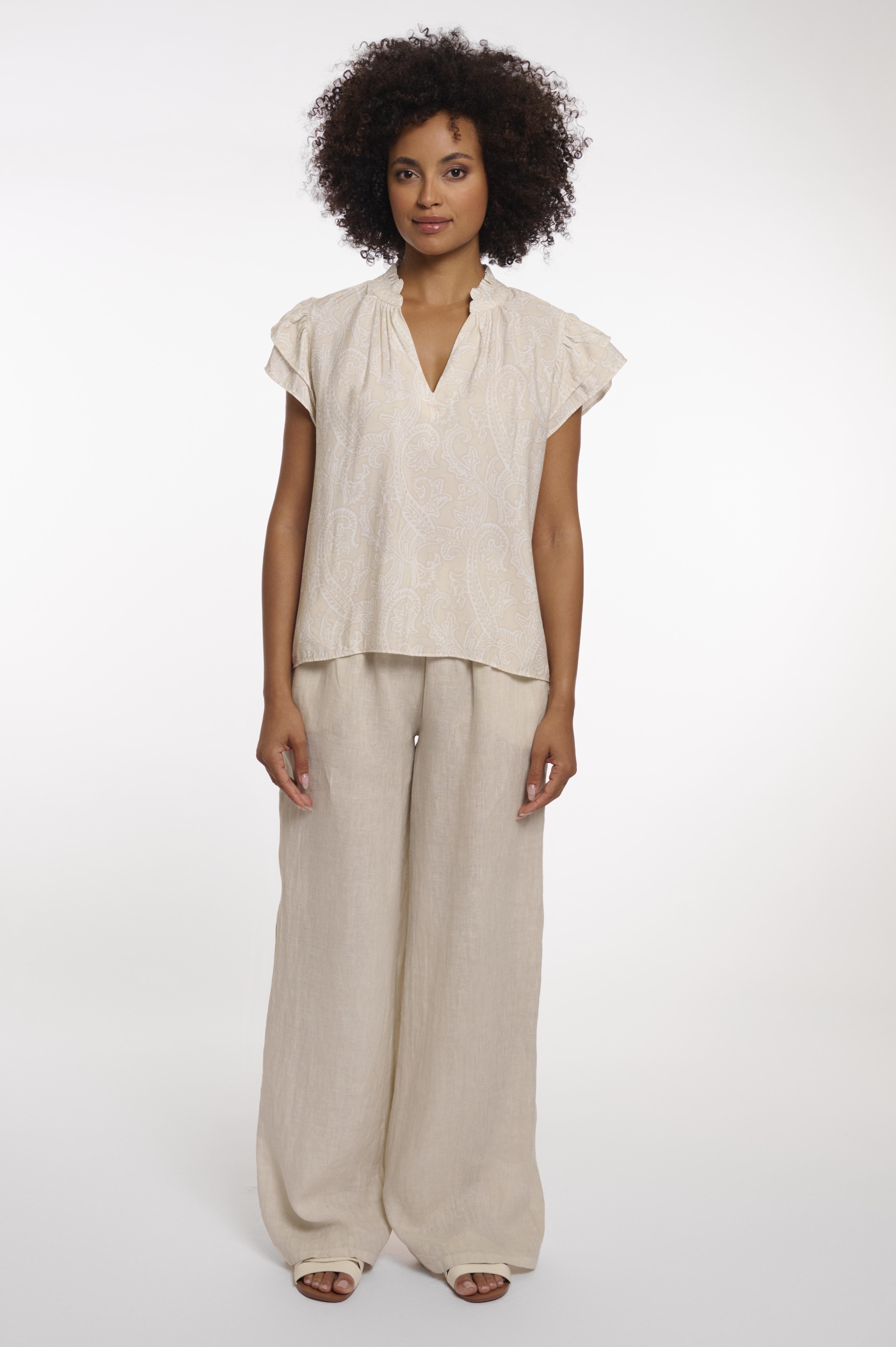Ga voor moeiteloze elegantie met deze luchtige blouse, vervaardigd uit een lichte, soepel vallende stof met een zachte V-hals die wordt omlijst door een delicate ruchesrand. De verfijnde ruchesmouwen en het subtiele uitsnijdingdetail aan de achterkant zorgen voor een vrouwelijke touch, terwijl het silhouet luchtig en licht blijft. Deze blouse is perfect voor warme dagen en valt met een ongedwongen elegantie die moeiteloos combineert met zowel strakke als relaxte looks.85% viscose, 15% polyamide.
