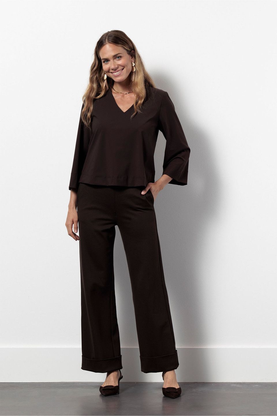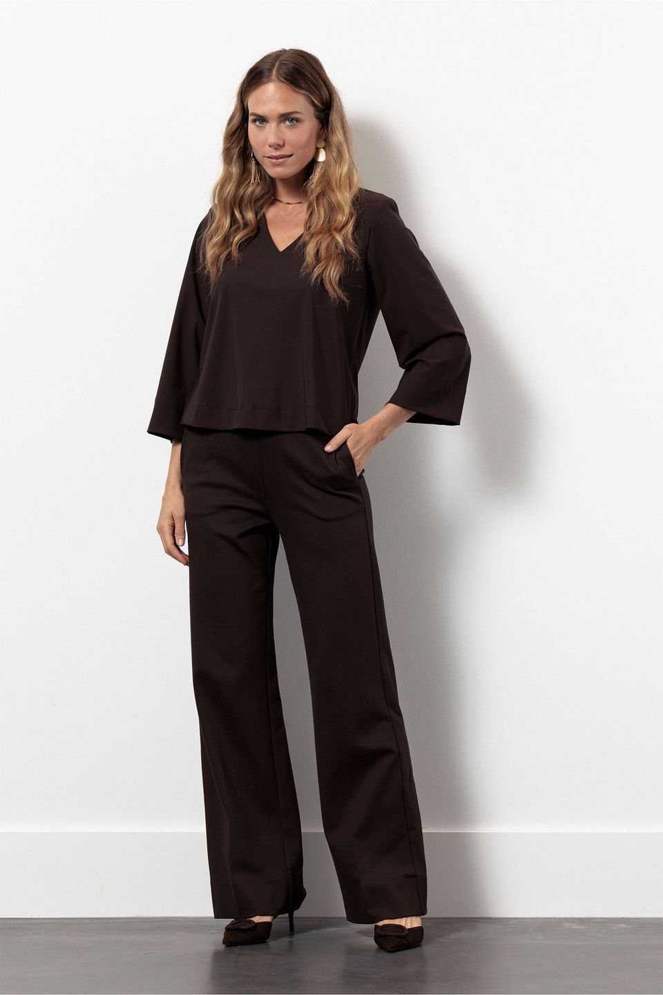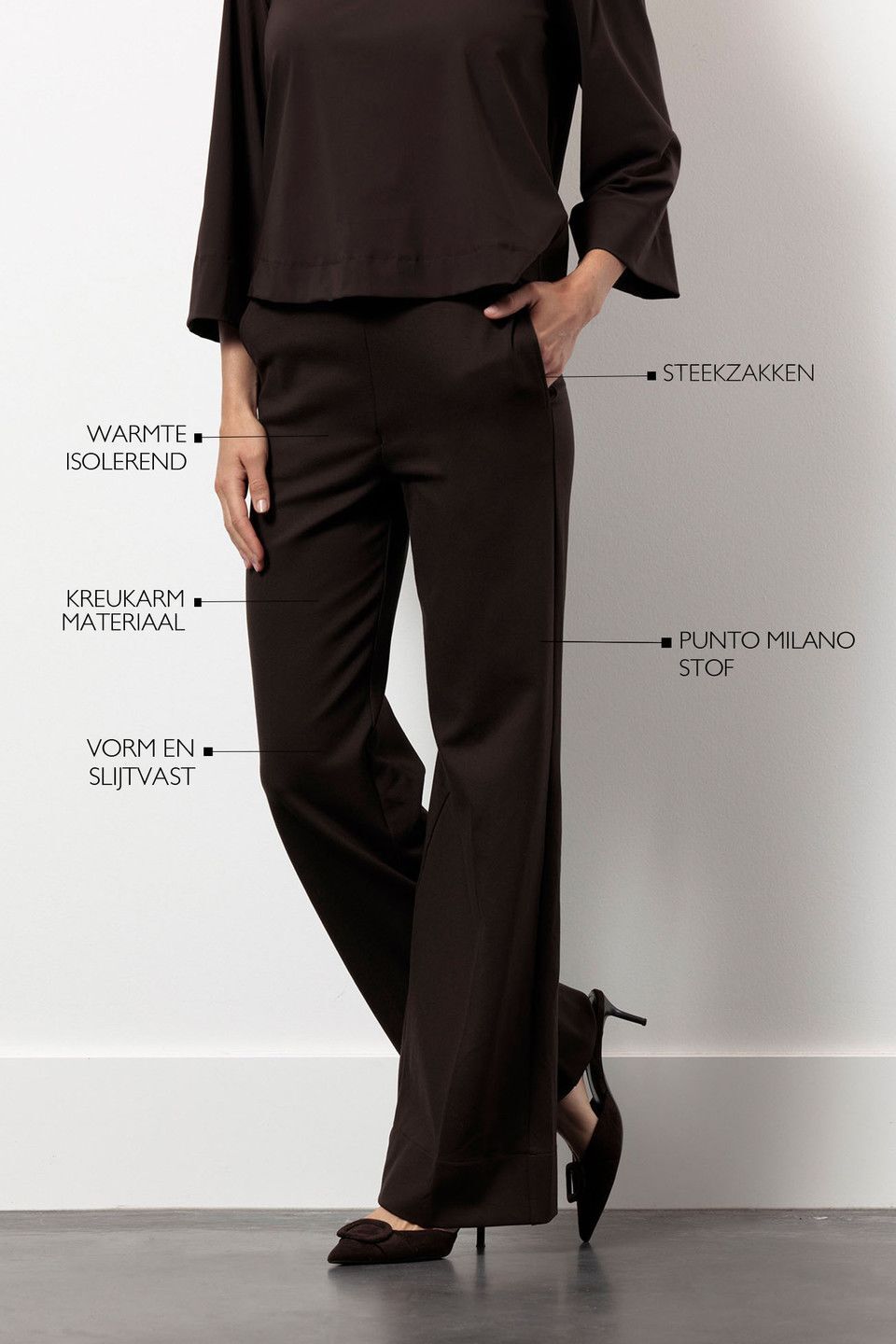 De Loreen punto trousers van Studio Anneloes is een tijdloze broek die elegantie en comfort samenbrengt. De diepe kleur Espresso en de stevige Punto Milano stof maken dit item perfect voor de koudere maanden. Met de wijde pijpen creëer je een stijlvol en modern silhouet.71% Viscose, 25% Polyester, 4% Elastaan.
