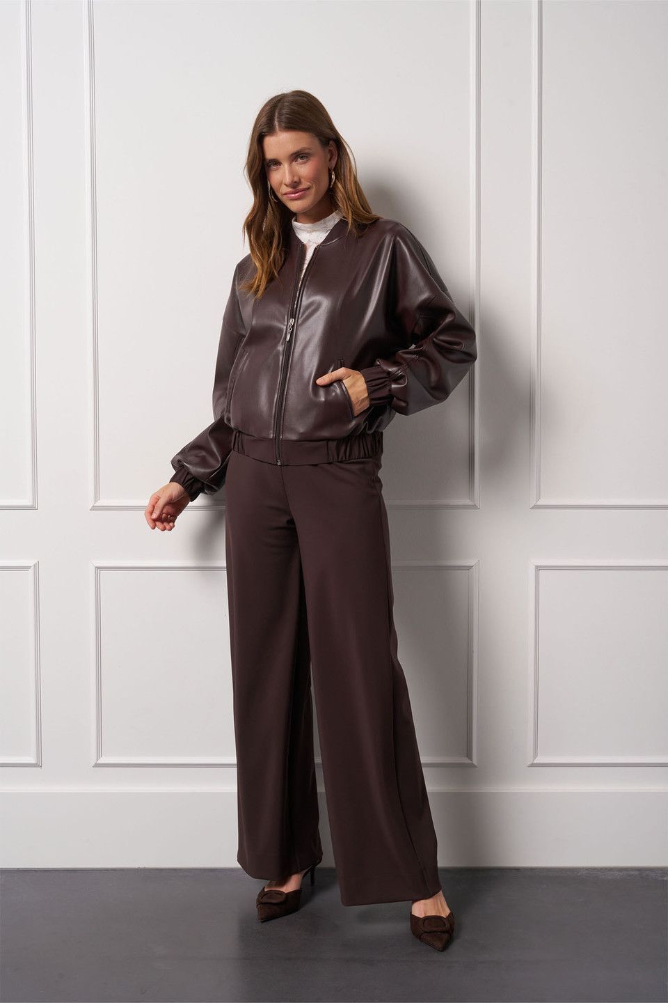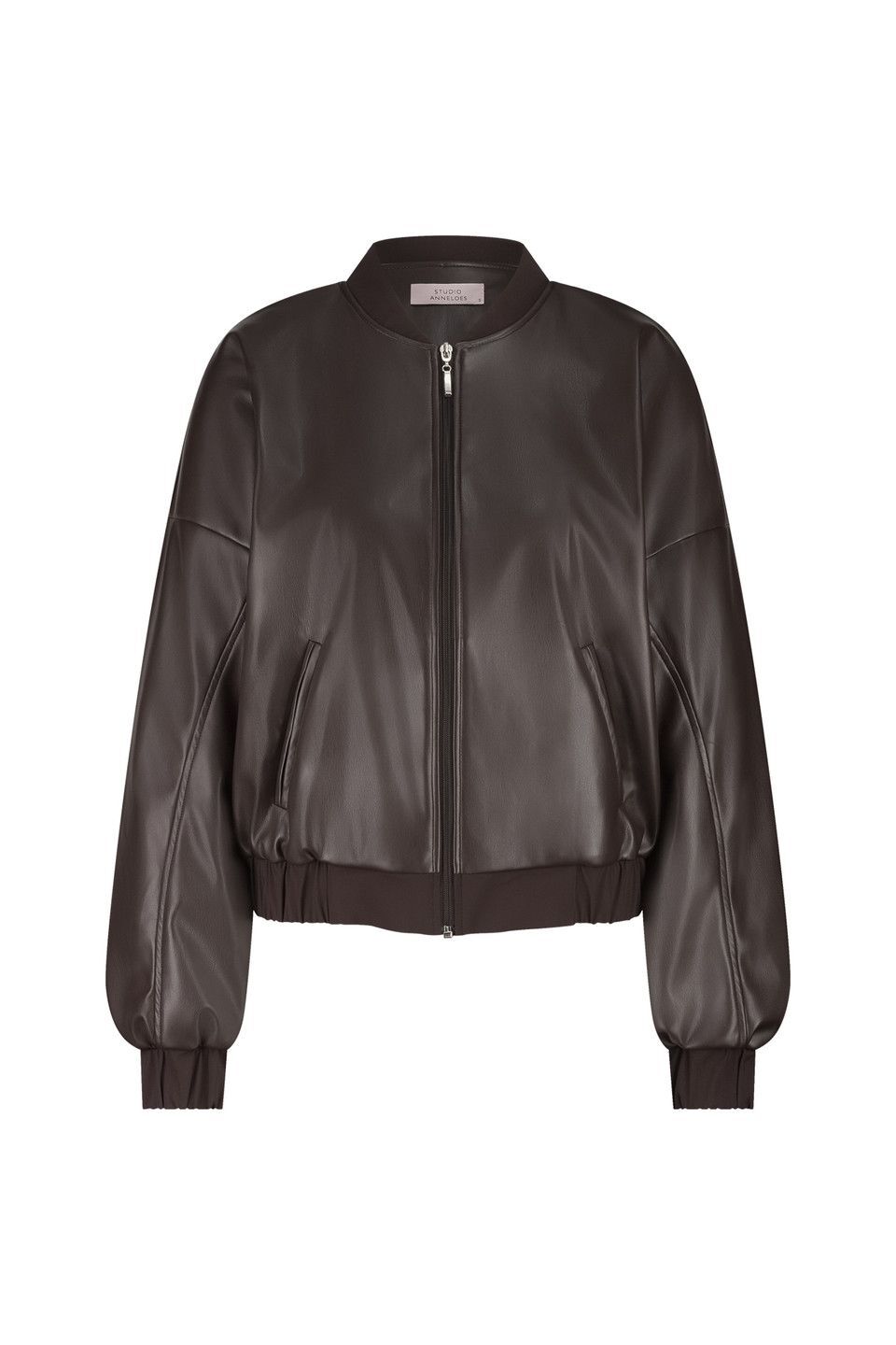 De Mayte faux leather bomber van Studio Anneloes is een stoere jas met een verfijnde twist. De diepe kleur Espresso en het glanzende faux leather zorgen voor een luxe look, terwijl de details in travelstof bijdragen aan het comfort.50% Polyurethaan, 50% Polyester.