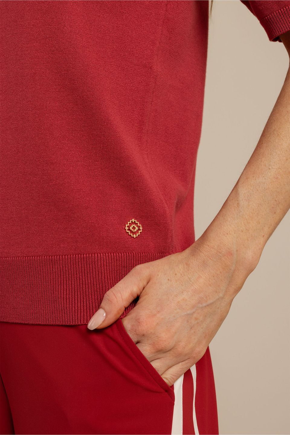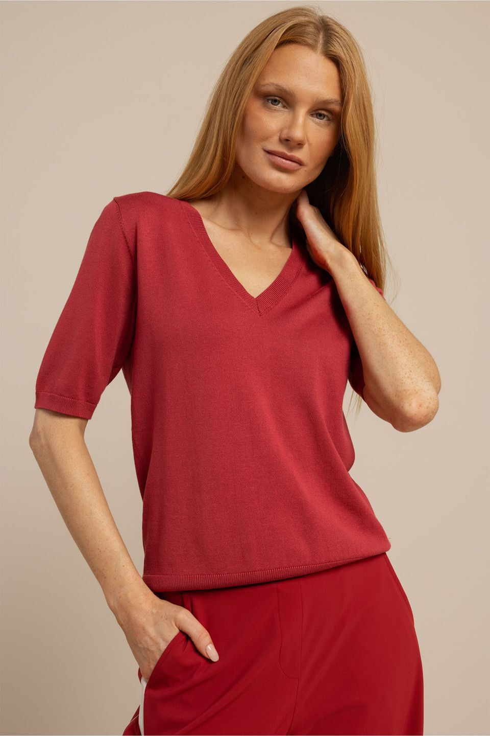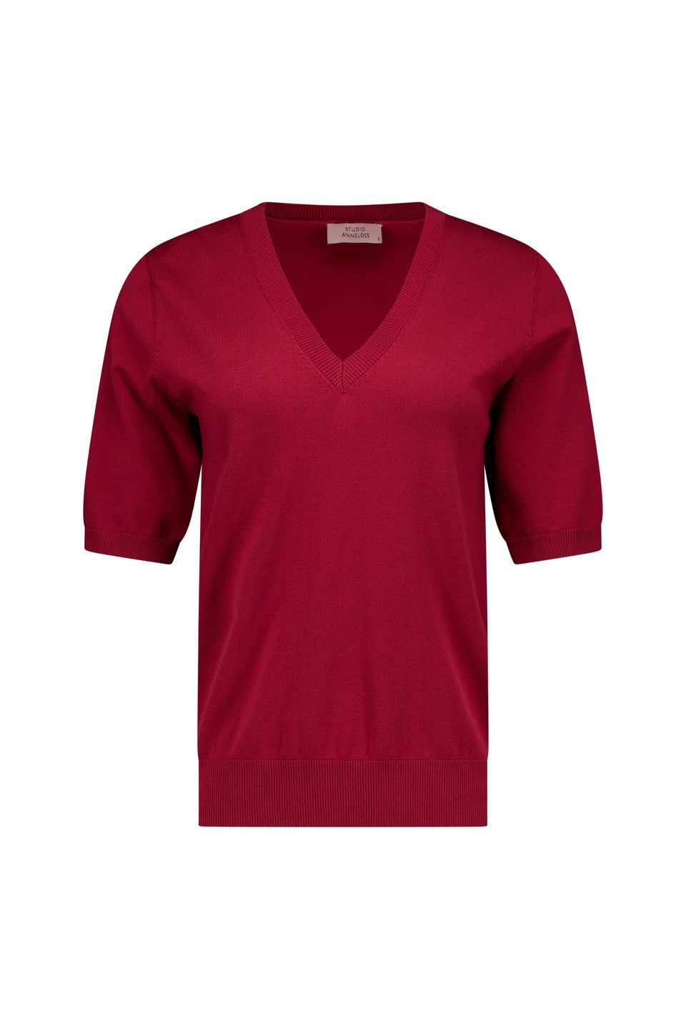 De Truida pullover van Studio Anneloes is een verfijnde basic met een krachtige uitstraling. De regular fit en het soepele travel knit zorgen voor een elegant silhouet met comfortabele stretch, terwijl de v-hals en korte mouwen het ontwerp een vrouwelijke en tijdloze touch geven. In Ruby Red maak je een stijlvol statement.70% Viscose, 30% Polyamide.