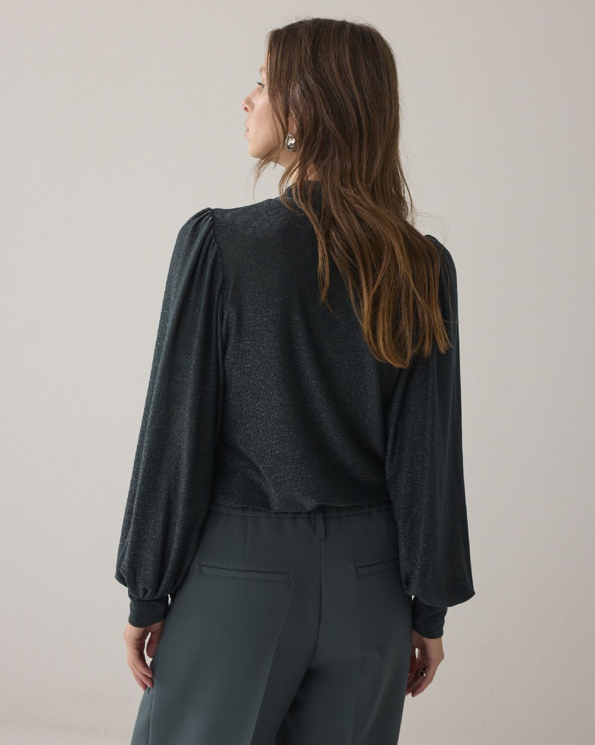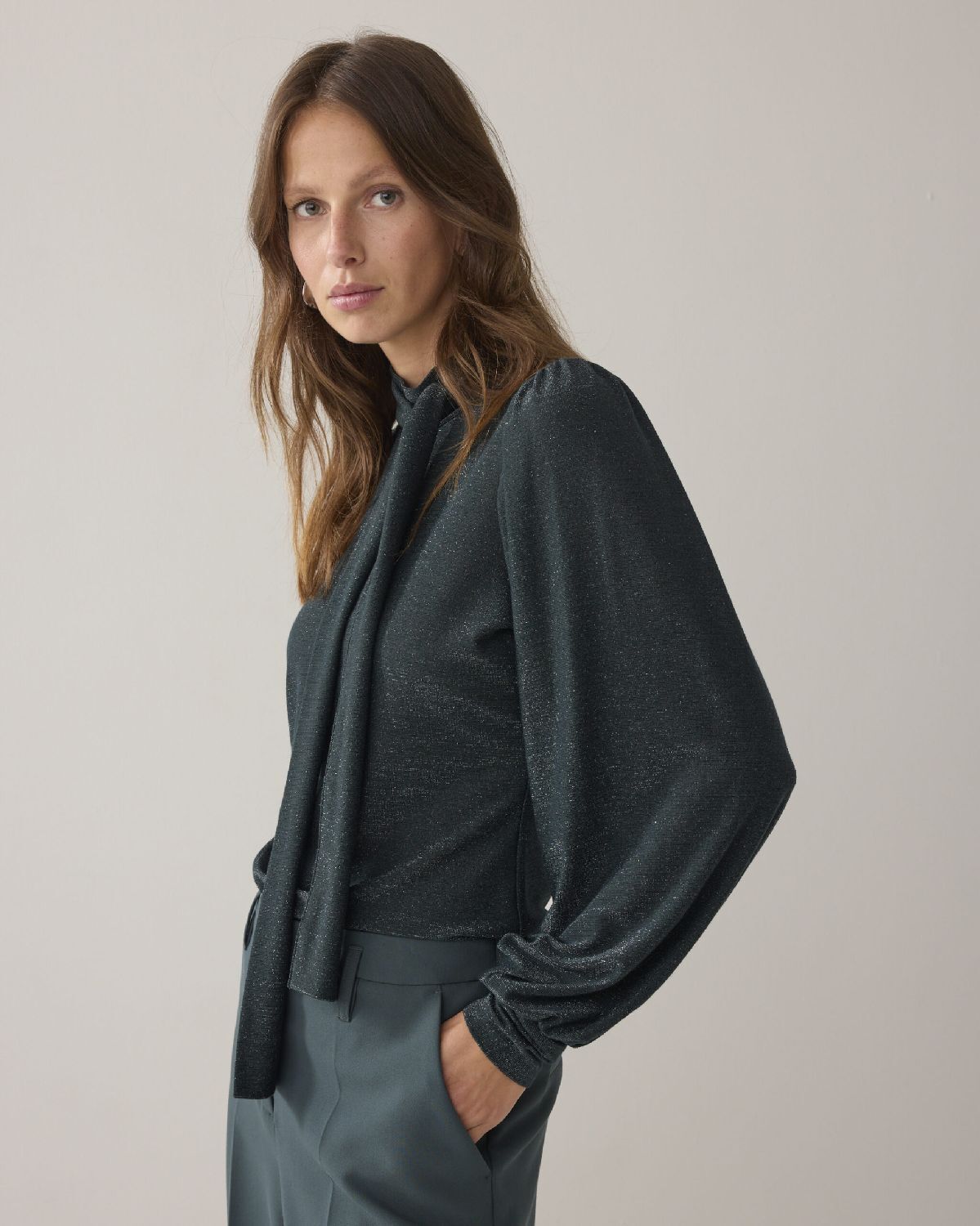 Top met lange mouwen van zachte lurex jersey met glans. De top heeft een aansluitende fit, lange pofmouwen en een lage col met afneembare sjaal in dezelfde stof.45% Polyester, 15% Polyamide, 15% Acetaat, 20% Viscose, 5% Elastaan