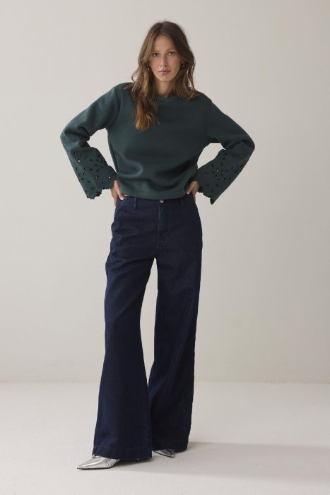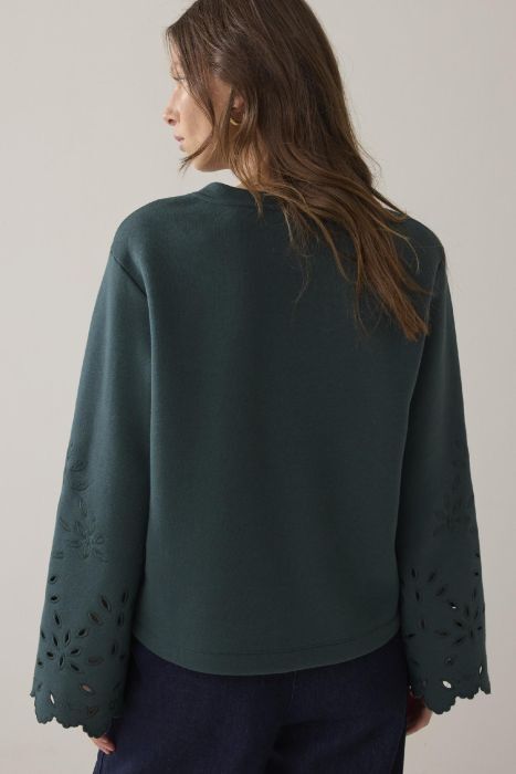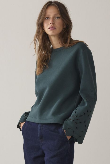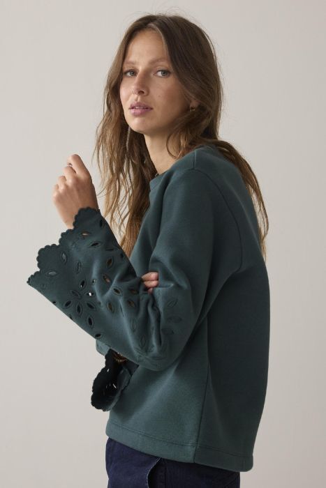 Trui van zachte sweatstof met een brushed binnenkant. De trui heeft een ronde hals en flared mouwen die zijn versierd met open en dichte broderie anglaise.80% Katoen, 20% Polyester.