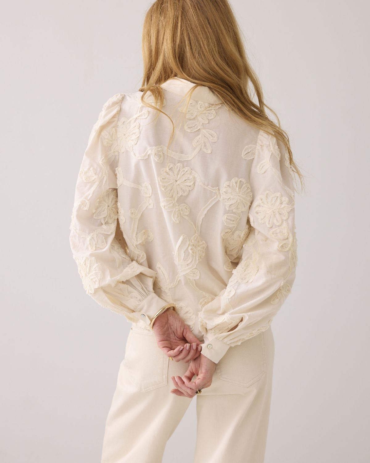 Deze rechte blouse is ontworpen met speels borduurwerk van raw edge-tape in bloemenpatroon. De blouse heeft parelmoer schelpknoopjes en pofmouwen.100% Katoen.