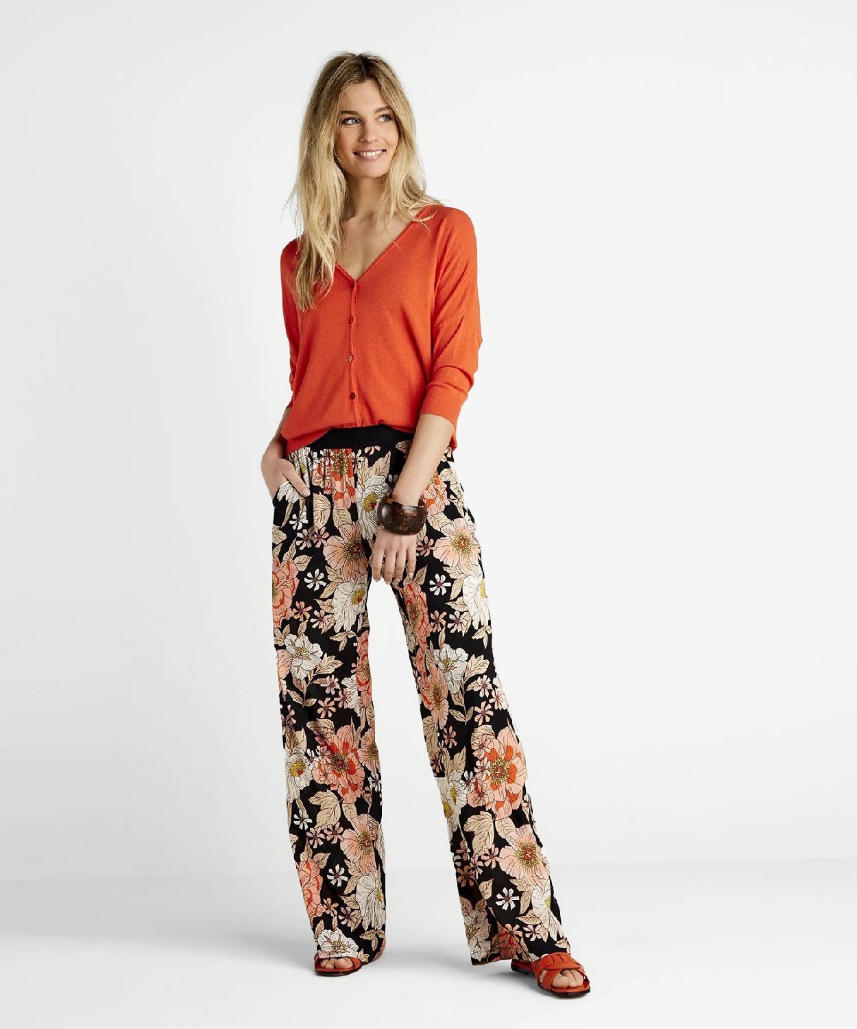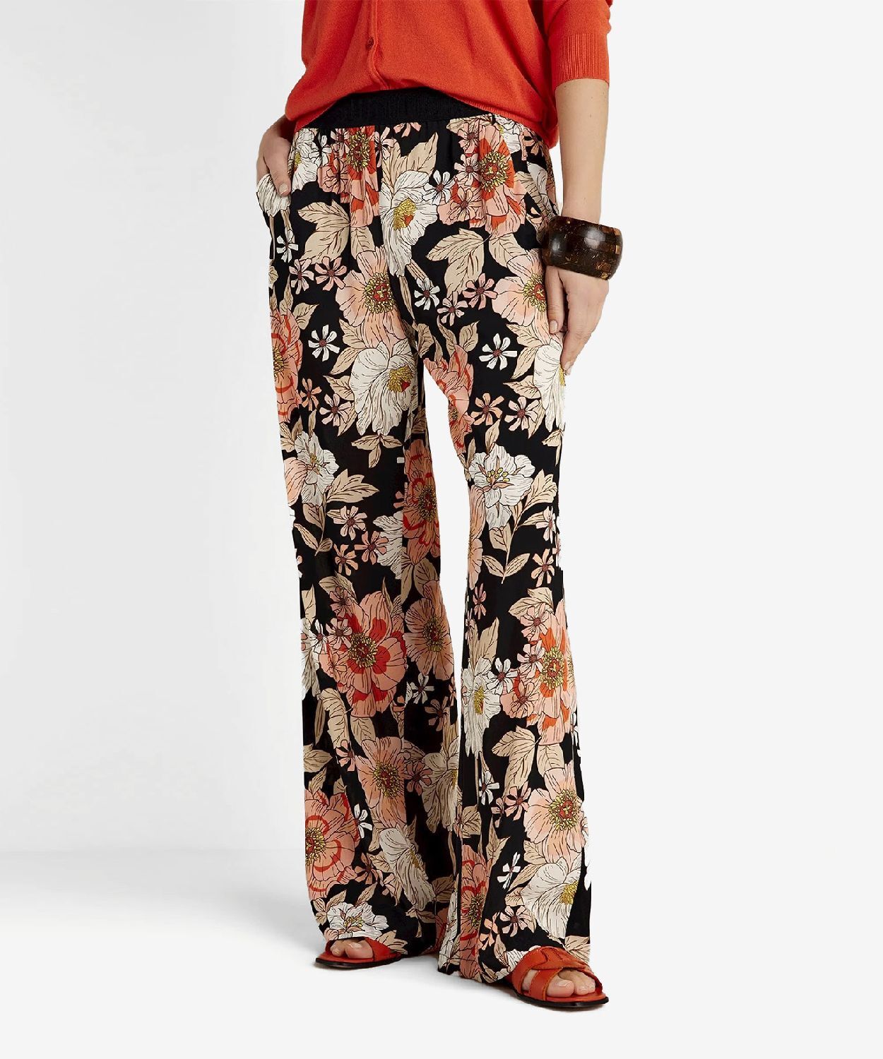 Deze bloemetjesbroek is voorzien van een fleurige print en wijde pijpen. Gemaakt van viscose en met een signature elastische taille heeft deze broek een aansluitende fit op de heupen. Deze luchtige broek heeft steekzakken aan de voorkant, wat het dragen praktisch maakt.95% viscose - 5% elastaan
