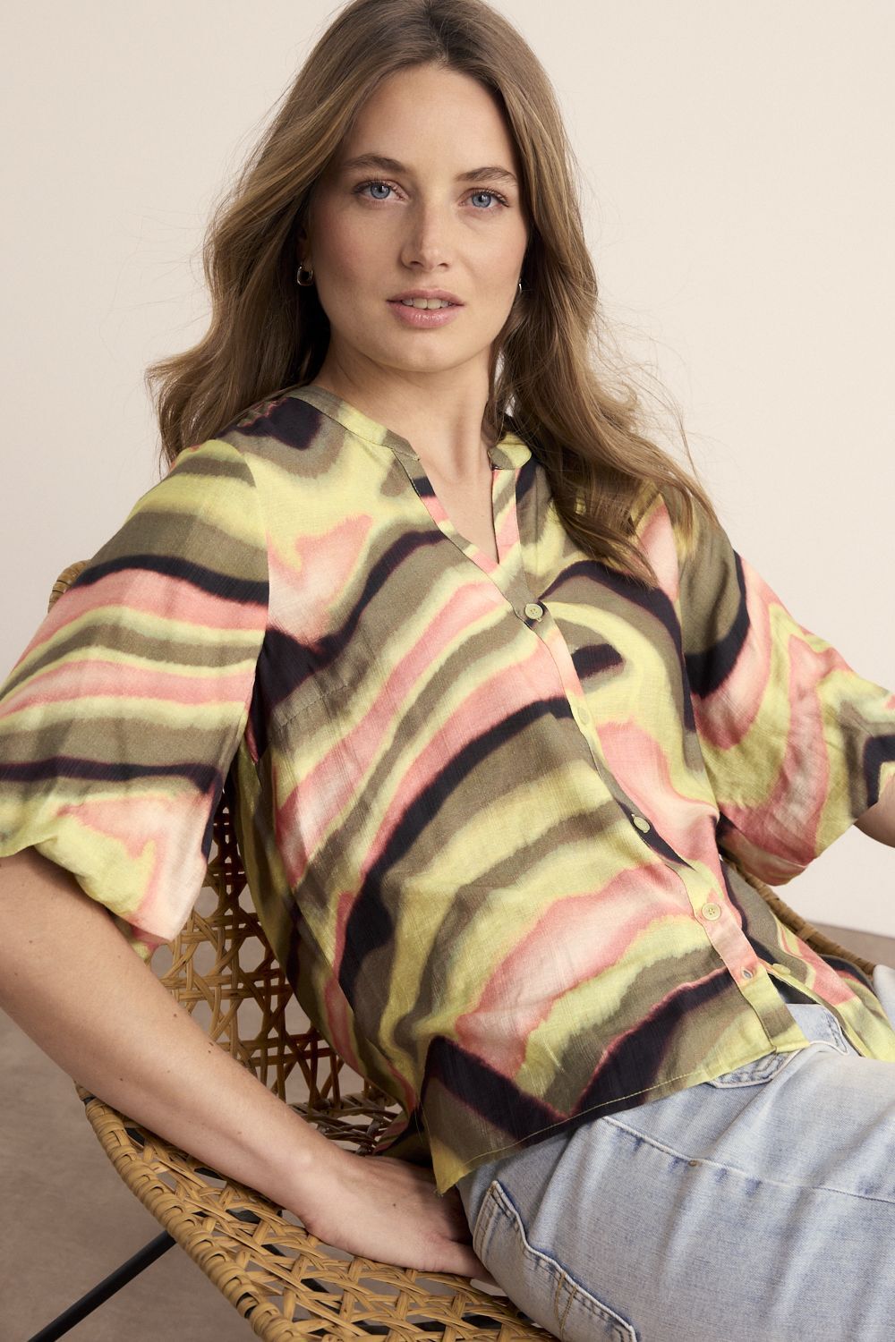 De Blouse Sunset Desert is een expressieve en luchtige blouse met een artistieke print en een moeiteloos vrouwelijke uitstraling. Deze blouse is vervaardigd uit een soepele en ademende stofmix van 85% viscose en 15% polyamide, wat zorgt voor een licht draaggevoel en een mooie, natuurlijke valling. De korte mouwen en de subtiele V-hals met knoopsluiting geven het ontwerp een verfijnde en toegankelijke look, terwijl de zachte transparantie bijdraagt aan een elegante, zomerse feel.