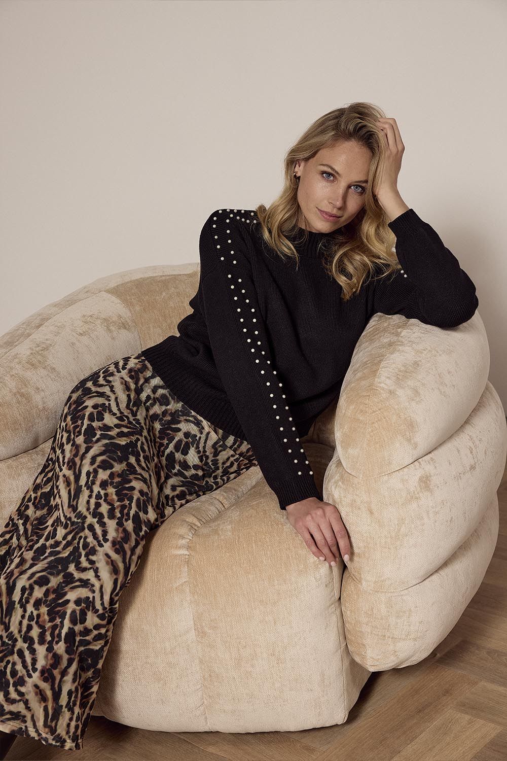 De Jumper Pearl Detail is een verfijnde en elegante keuze voor je wintergarderobe. Gemaakt van een luxe mix van 52% viscose, 28% polyester en 20% polyamide, biedt deze trui zowel comfort als een luxe uitstraling. De subtiele pareldetails langs de schouders en mouwen geven de trui een luxe en glamoureuze flair.