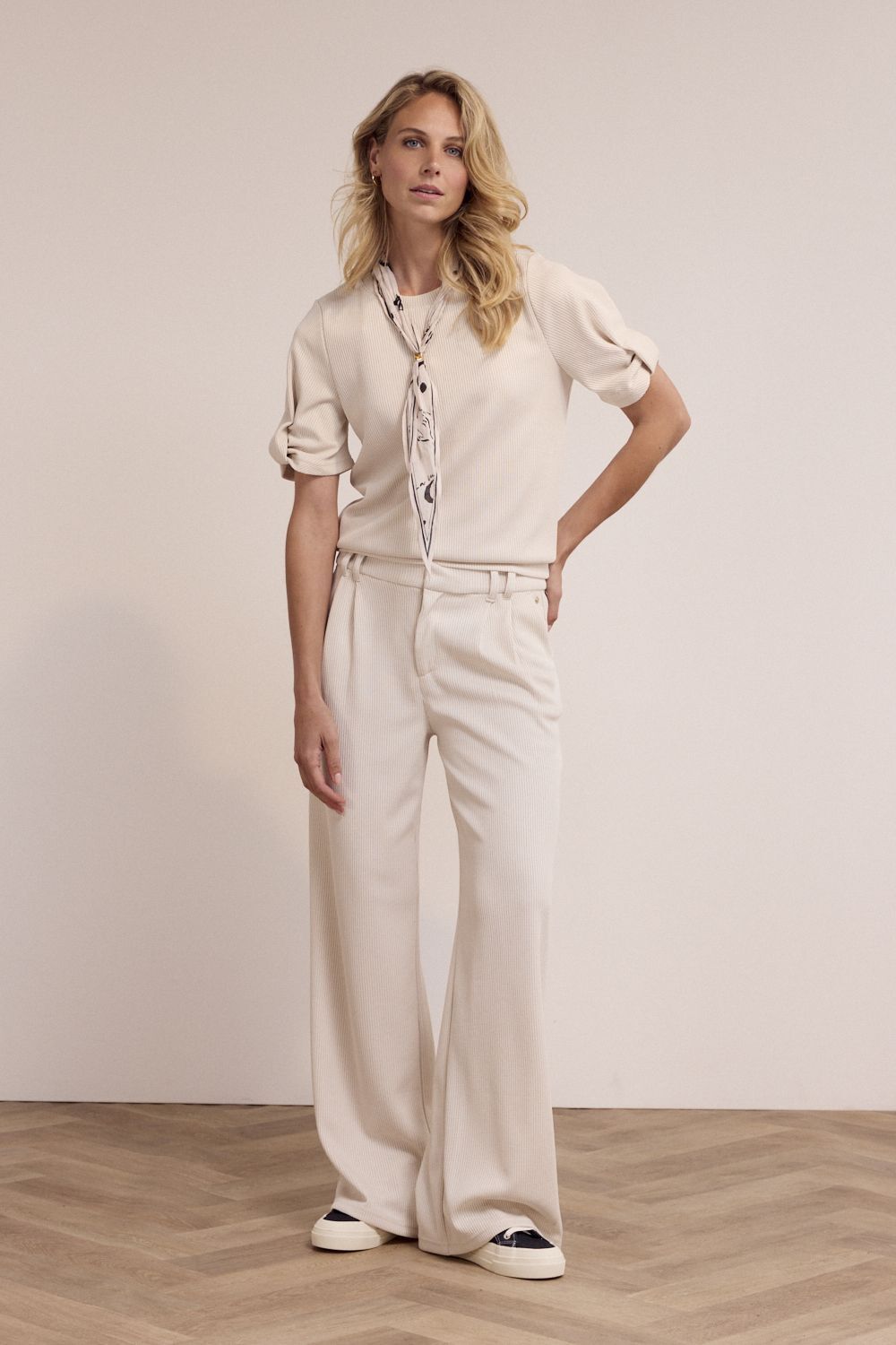 De Pleated-Waist Trousers is een elegante en comfortabele broek met een verfijnde uitstraling en een moderne, tijdloze look. Deze trousers is vervaardigd uit een soepele en stretchy stofmix van 95% polyester en 5% elastaan, wat zorgt voor een prettige pasvorm, optimale bewegingsvrijheid en een mooie, vloeiende valling. De geplooide taille geeft het ontwerp een chic accent en zorgt samen met de rechte, wijde pijpen voor een flatterend silhouet dat zowel comfortabel als stijlvol aanvoelt.