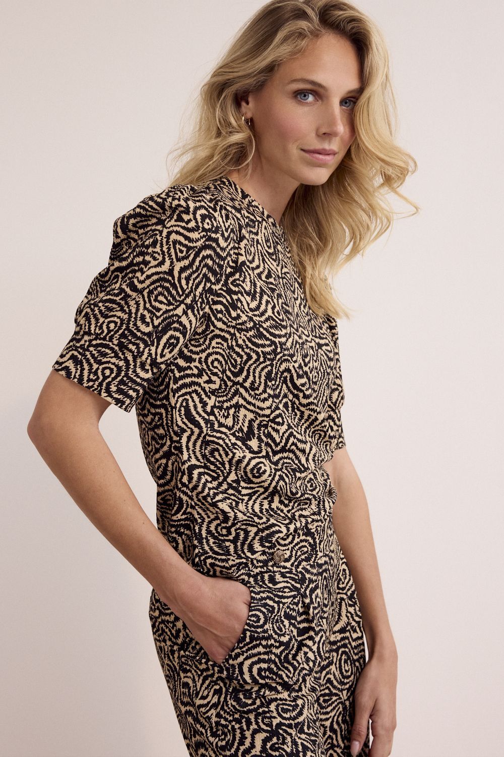 De Top Wandering Lines is een eigentijdse en vrouwelijke top met een opvallend grafisch dessin en een verfijnd silhouet. Deze top is vervaardigd uit een comfortabele en soepele stofmix van 95% polyester en 5% elastaan, wat zorgt voor een prettig draaggevoel, lichte stretch en een mooie valling. Het abstracte Wandering Lines dessin in Black & Pebble geeft de top een moderne, artistieke uitstraling en maakt dit item direct tot een eyecatcher. De ronde hals en halflange mouwen met subtiele volume-details zorgen voor een elegante, vrouwelijke balans. De licht aangesloten pasvorm valt mooi om het lichaam en maakt de top zowel comfortabel als flatterend.