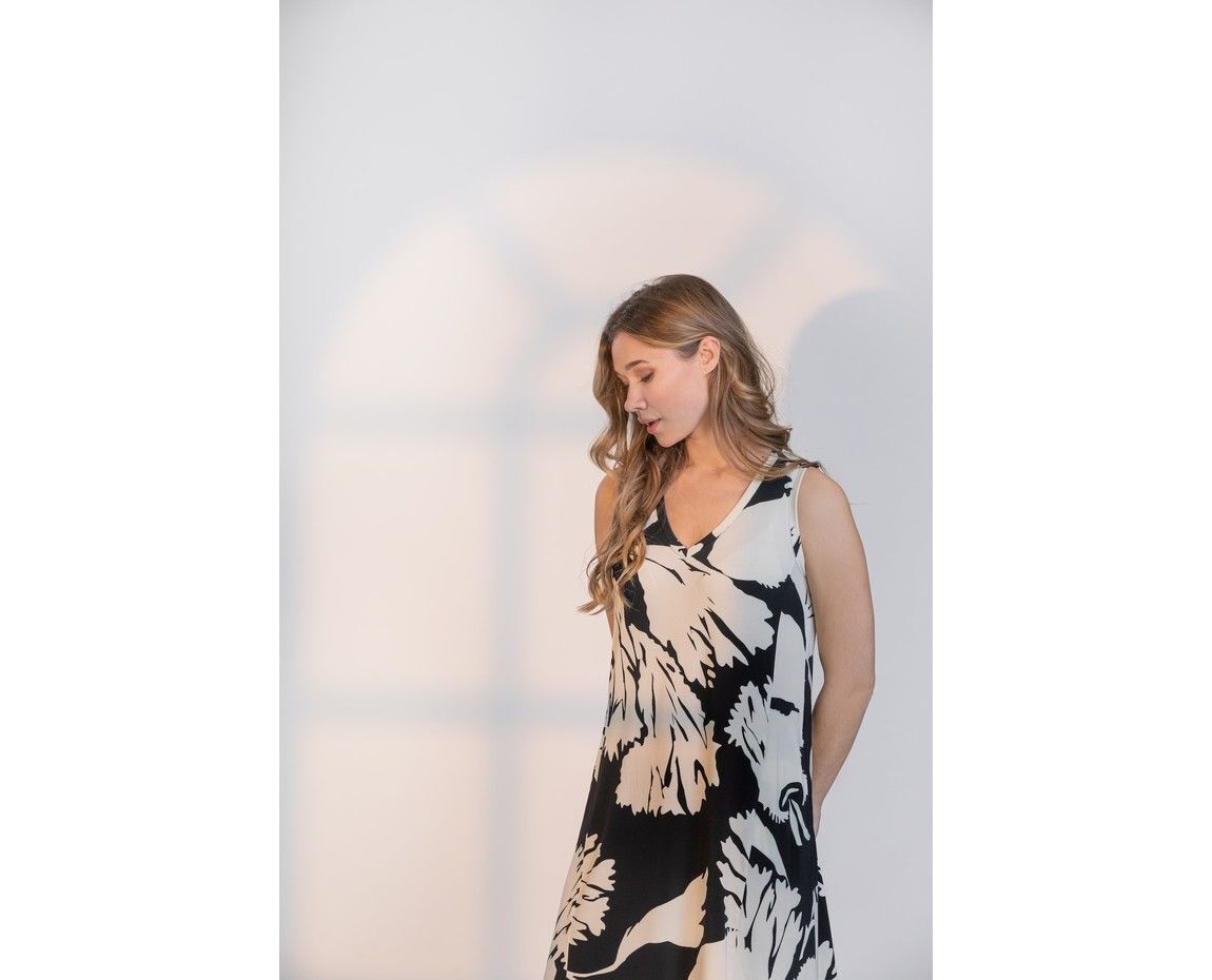 Deze mouwloze jurk met V-hals is gemaakt in een soft polyester kwaliteit.Jurk heeft zakken in de zijnaad.96% polyester 4% Elastaan