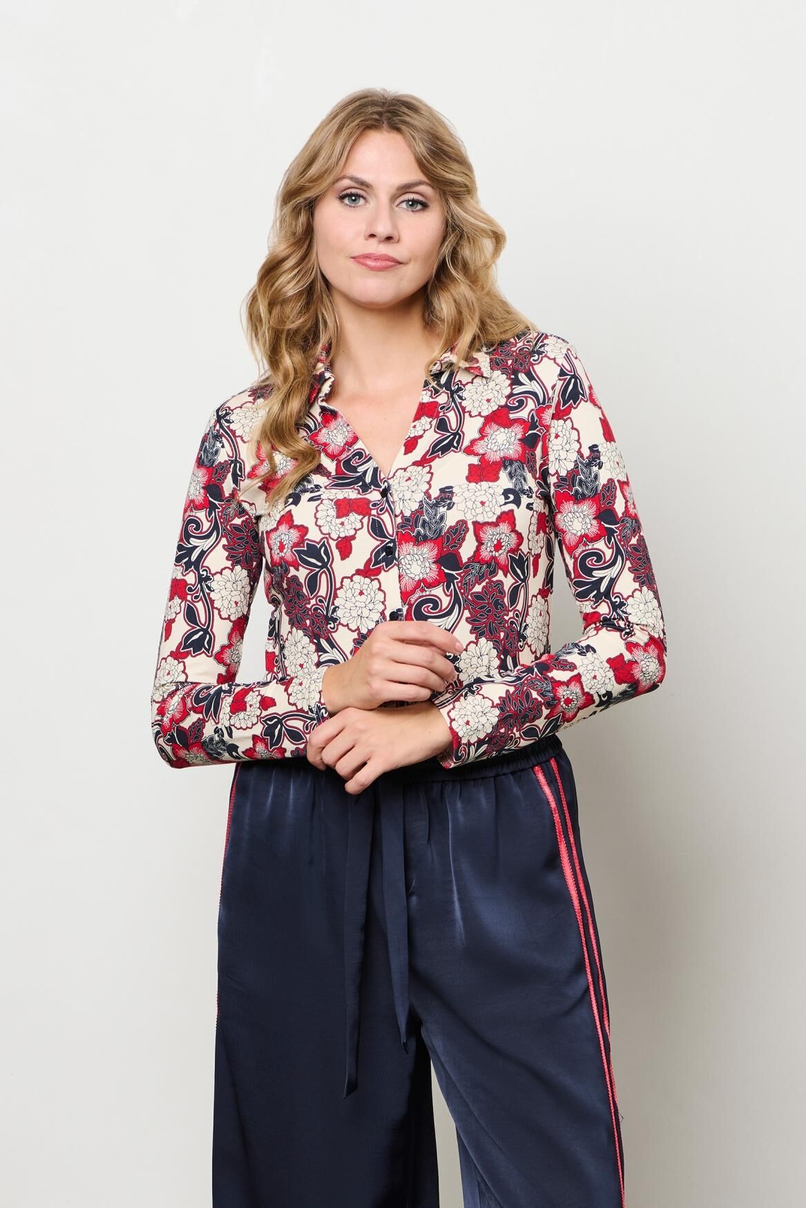 Deze blouse van &Co met lange mouwen is gemaakt in een jersey kwaliteit.V-HalsKnoopsluitingKraag/staanderLange mouwen.96% Viscose 5% Elastaan.